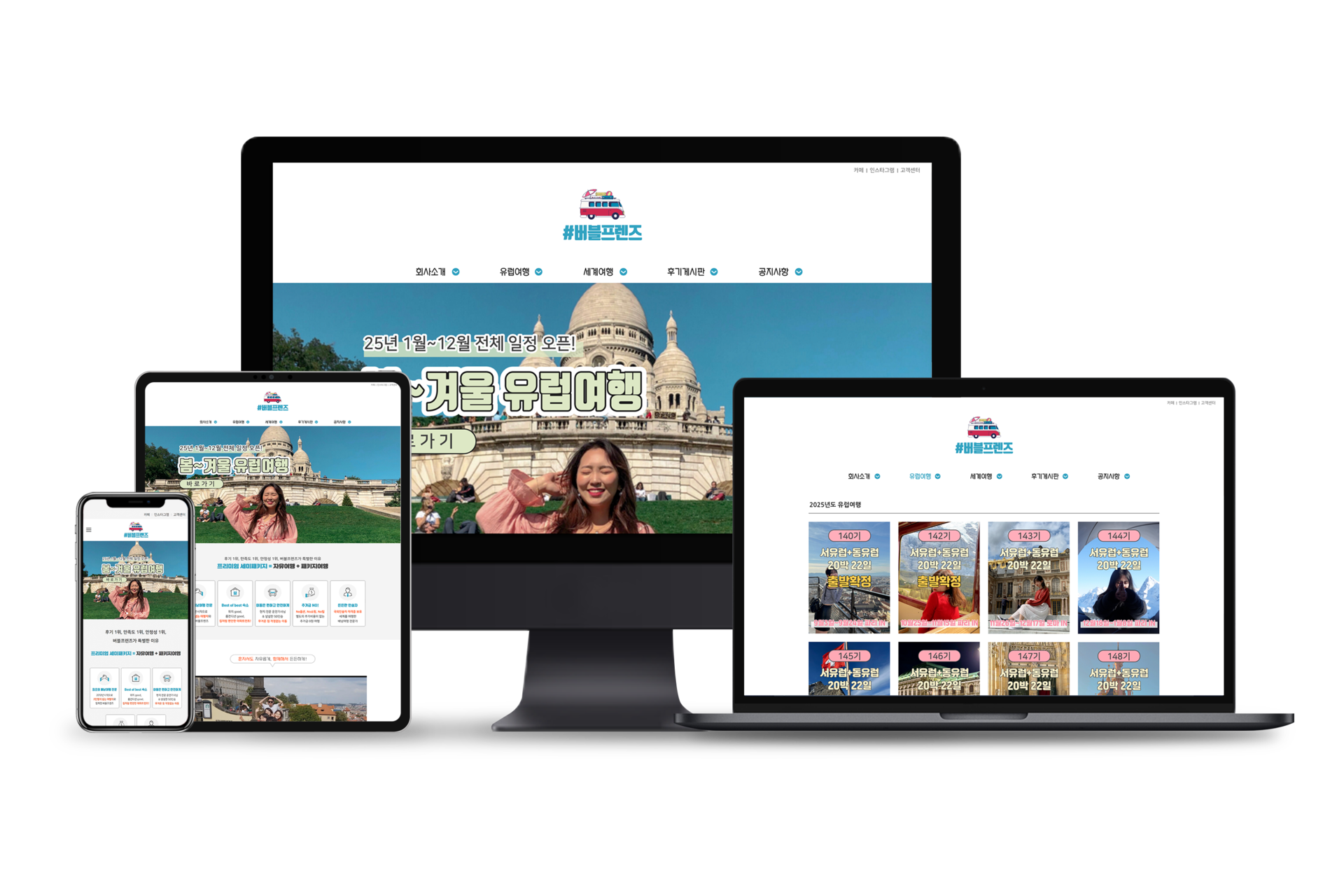 코스가 이미지 중심의 카드형 리스트로 구성되어 있어 여행지별기간별 패키지를 한눈에 파악하고 선택할 수 있게 설계했습니다.