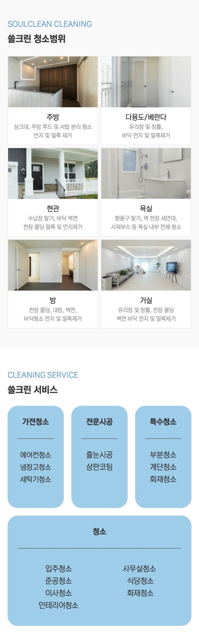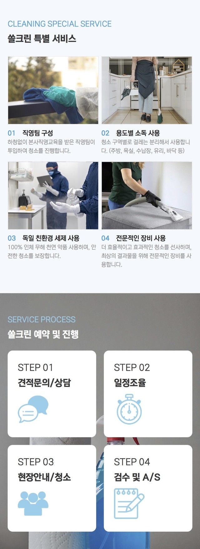 특수청소·가정청소 등 카테고리를 한눈에 볼 수 있는 서비스 소개