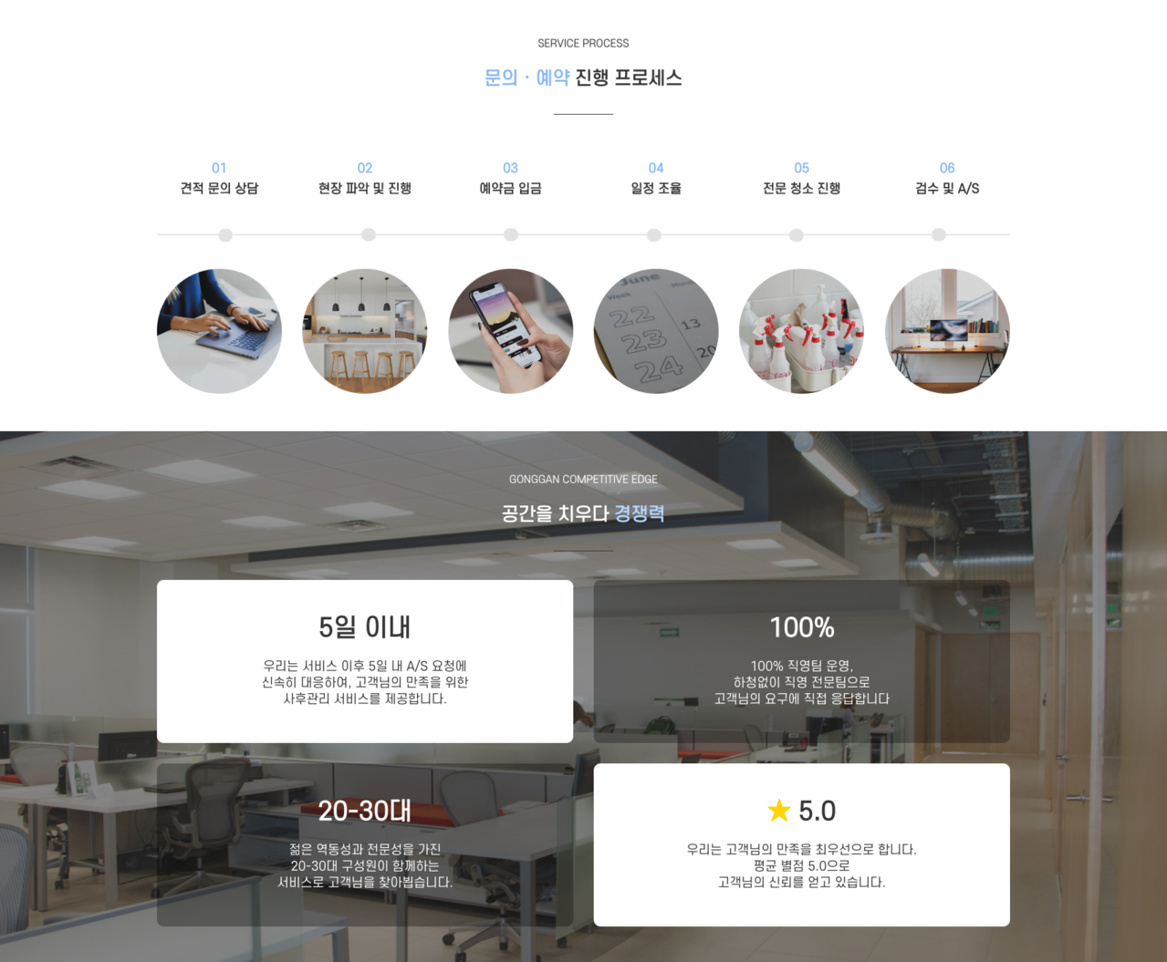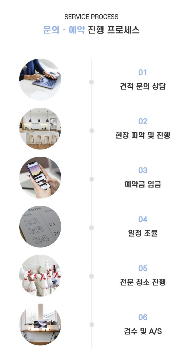 예약 프로세스는 상담 → 일정 조율 → 현장 시공 → 검수 및 A/S