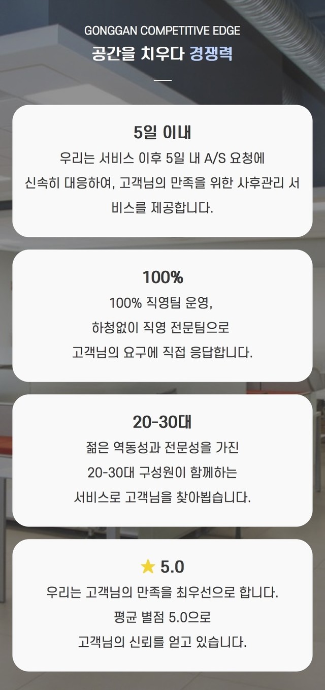 있으며, 각 서비스별 강점과 작업 범위를 짧고 명확한 카피로 안